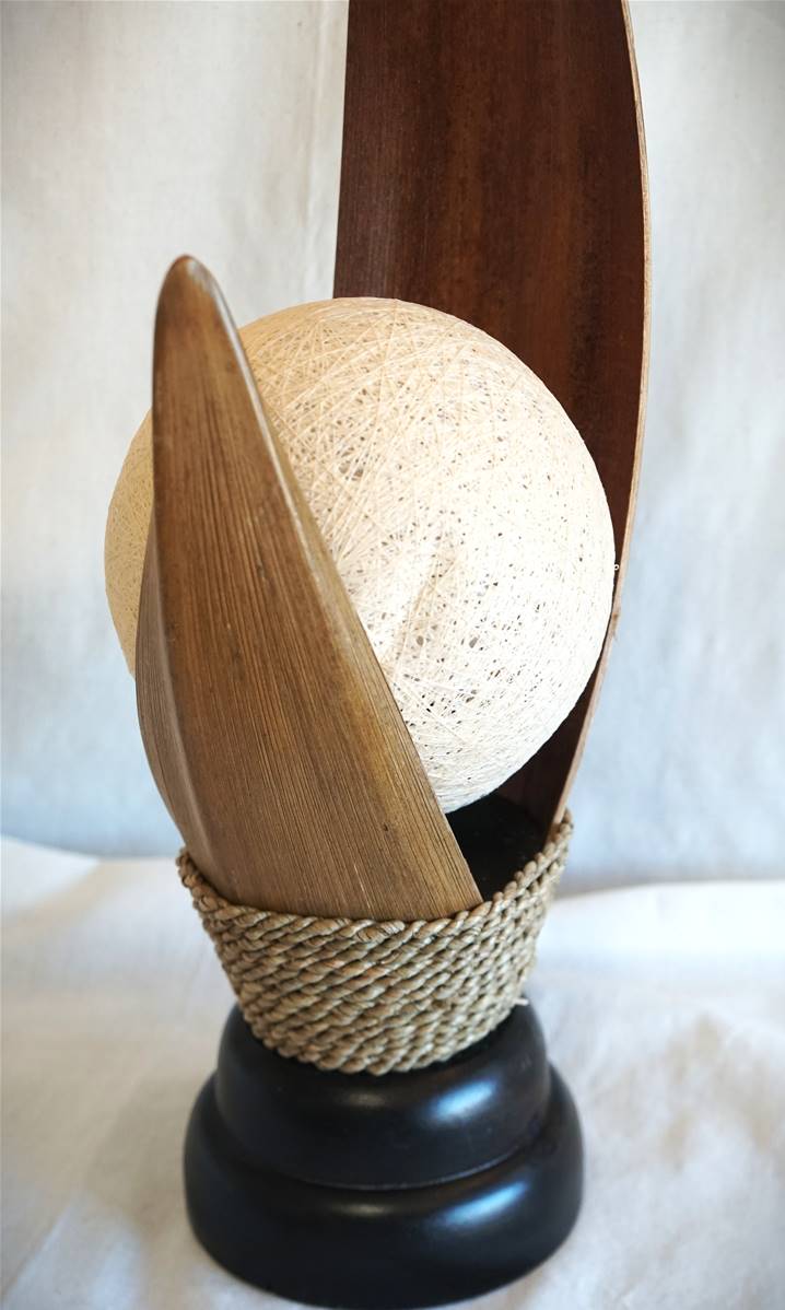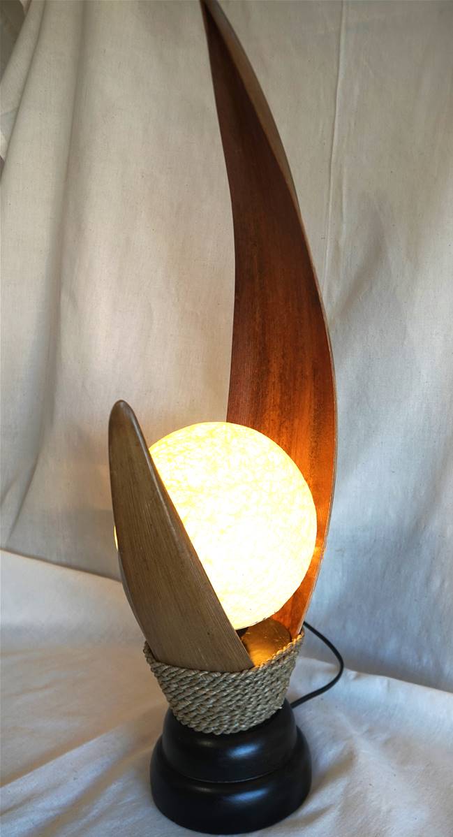 Lampe à poser en feuilles de palmier, socle en bois.